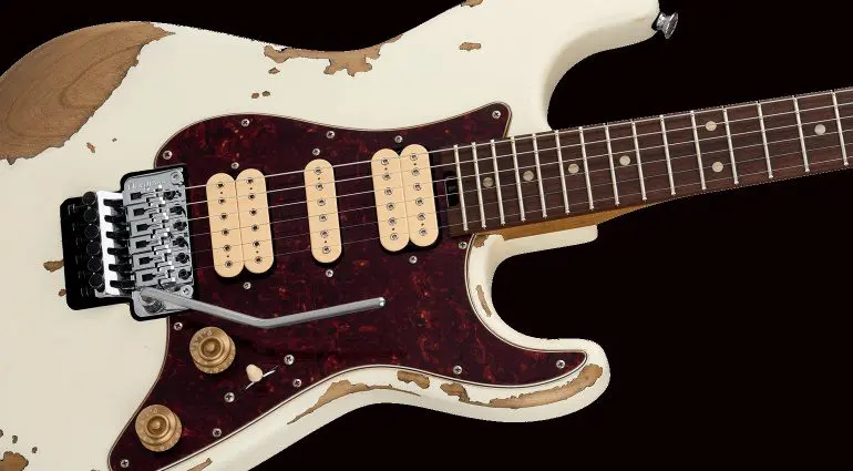 La Charvel Super Stock SC1 vanta caratteristiche altamente performanti come il ponte Floyd Rose, il locking nut e i pickup Super Distortion. In contrasto con il corpo in ontano aged.