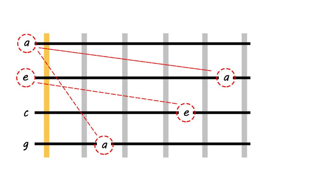 - L’intonazione al secondo tasto della corda G è un A, corrispondente quindi alla prima corda aperta.