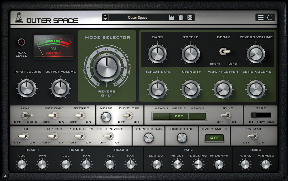 Sebbene esistano molte emulazioni software del famoso Roland Space Echo, Audiothing Outer Space è una delle migliori. Outer Space porta la spettacolare macchina verde nella vostra DAW con una buona dose di parametri aggiuntivi.