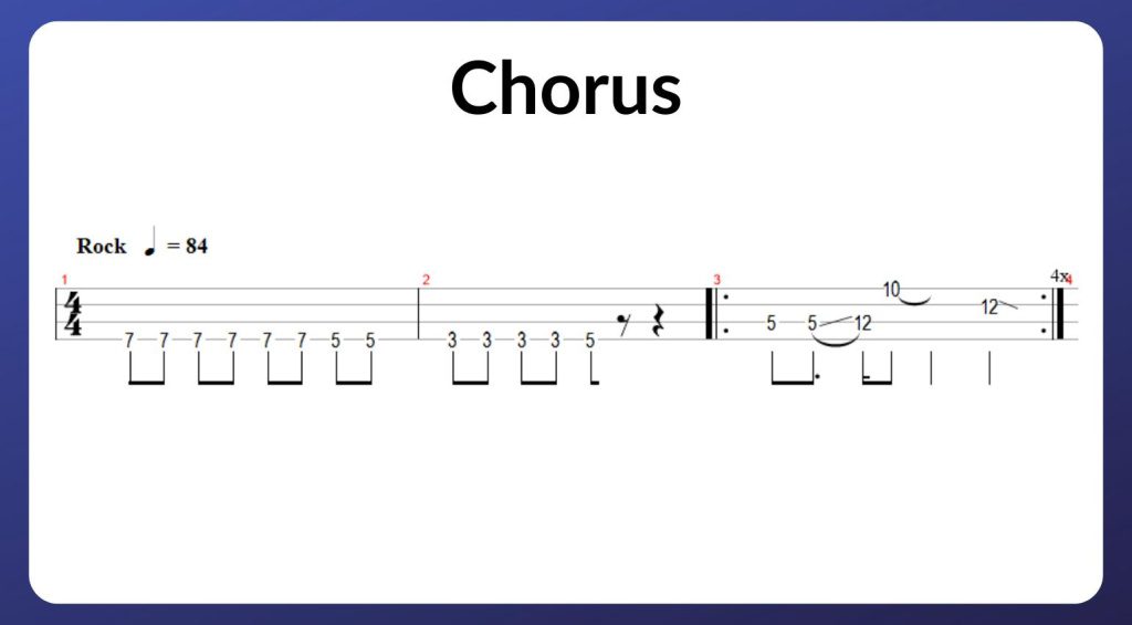 Entrando nel vivo della canzone, le cose cambiano un po’. Come abbiamo già visto, la nostra strofa consiste in quattro battute dedicate al primo riff. Adesso, però, incontriamo un altro riff che occupa le due battute successive.