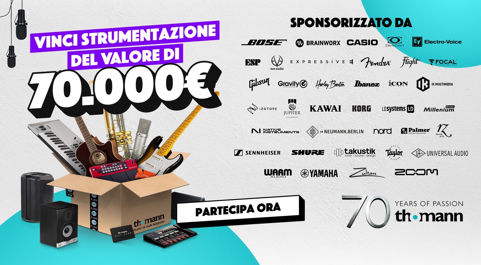 Concorso per il 70º Anniversario di Thomann: il 70° anniversario di Thomann offre numerose promozioni (Thomann Golden Ticket) e un concorso senza precedenti. In palio ci sono strumenti e articoli musicali per un valore complessivo di 70.000 euro (!). Il concorso si svolge dal 30 settembre al 29 ottobre 2024 ed è suddiviso in sette turni. Per partecipare, basta iscriversi alla newsletter di Thomann e risolvere gli enigmi che contiene. Ogni settimana verrà inviato un nuovo rompicapo, che dovrà essere risolto entro sette giorni. È possibile partecipare al concorso inviando il modulo di risposta. Non potrebbe essere più facile e vale la pena partecipare.