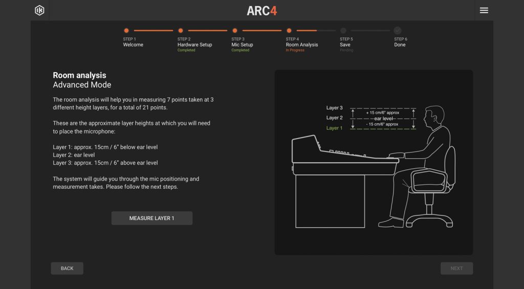 Nel passaggio successivo, il software di analisi vi mostrerà le posizioni esatte, cioè dove posizionare il microfono di misurazione nella stanza e a quale altezza. Non è necessario seguire esattamente la posizione indicata, poiché non è sempre possibile a causa della disposizione della stanza. Io ho optato per un’analisi a 21 punti, che misura sette punti nella mia sala “piccola” di controllo a tre diverse altezze (15 cm sotto l’altezza dell’orecchio, all’altezza dell’orecchio e 15 cm sopra l’altezza dell’orecchio) per il mio profilo di studio. Prima di iniziare ogni misurazione, è necessario confermare con un clic del mouse e poi allontanarsi dal microfono per non disturbare/intercettare eventuali riflessioni. Il software utilizza diversi sweep sinusoidali dai diffusori destro e sinistro per ogni posizione per creare il profilo di correzione.