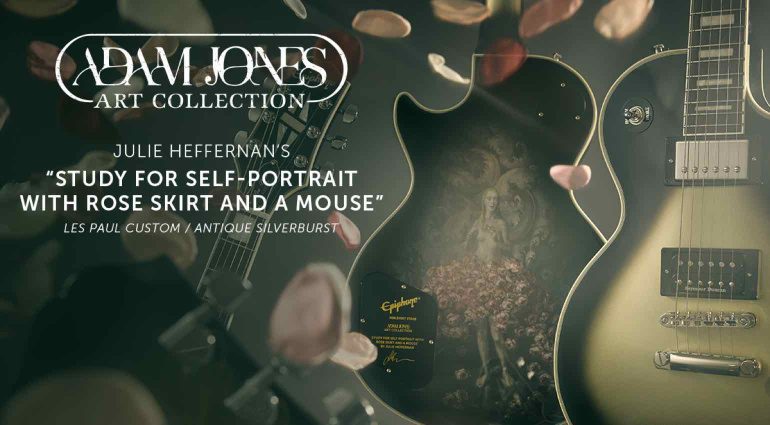 La Epiphone “Adam Jones Study for self portrait with rose skirt and a mouse” di Julie Heffernan è la terza puntata della Art Collection. Una gamma di Les Paul Custom Silverburst, ognuna con un’opera d’arte diversa sul retro.
