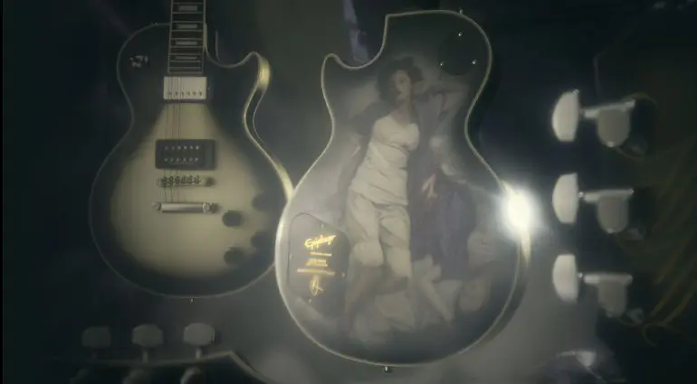 Questo ultimo modello Epiphone Adam Jones Les Paul Custom Silverburst signature ha un’opera d’arte della moglie Korin Faught sul retro. L’opera si chiama Sensation ed è l’ultima di una lunga serie di modelli Art Collection della sua gamma.