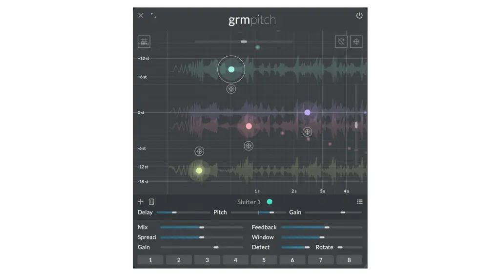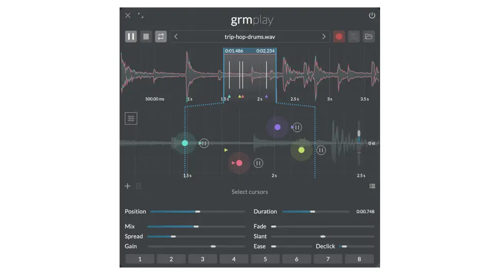 Uno degli effetti più impressionanti è stato un effetto di campionamento granulare chiamato GRMplay. Questo richiede l’inserimento di un file audio come materiale di partenza, e poi si possono creare più playhead che riproducono simultaneamente parti diverse della forma d’onda, creando un effetto polifonico, simile a quello dei droni, dal materiale di partenza vocale. Inoltre, ingrandendo o rimpicciolendo il suono, è possibile modificare il timbro del suono, mettendo in loop pezzi più o meno lunghi del file audio di partenza.