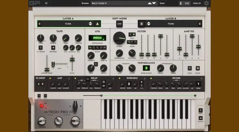 L’originale M-Tron Pro fu un successo immediato e seguirono molti aggiornamenti e banchi di suoni, ma è stato nel giugno di quest’anno che questo leggendario plugin di questo leggendario strumento è stato riportato al passo con i tempi. L’interfaccia grafica di M-Tron è sempre stata un po’ strana ai miei occhi, ma negli ultimi due anni GForce ha compiuto uno sforzo valoroso e preciso per risolvere le carenze dell’interfaccia grafica, con enorme successo. M-Tron Pro IV sfoggia ora un’interfaccia superba, chiara e intuitiva che consente un accesso immediato a tutte le sue funzioni. È facile da capire ed è ancora più facile navigare nell’enorme quantità di preset che questo strumento offre.