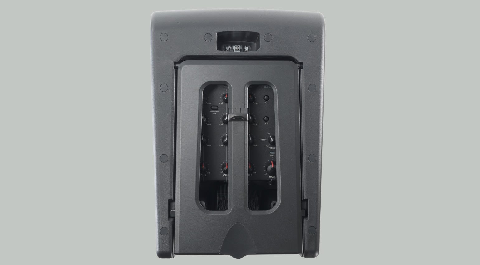 A bordo di questo sistema, troverete un mixer a 3 canali con ingressi da 1/4″ e XLR (inclusa l’alimentazione phantom) e un semplice EQ a due bande per ogni canale. Inoltre, sono presenti effetti presi dalle aziende affiliate del gruppo Harman, tra cui la soppressione automatica del feedback dbx, il ducking audio Soundcraft, 5 preset di equalizzazione e connettività Bluetooth.
