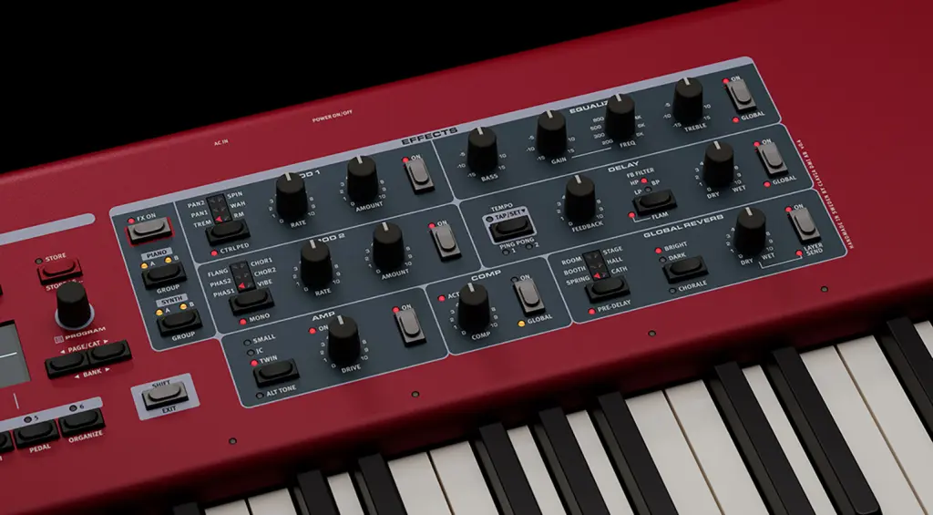 Anche alcuni effetti sono nuovi. Tanto per cominciare, il Nord Stage 6 dispone ora anche dello Spring Reverb del Nord Stage 4. Altri nuovi effetti includono nuove modalità di delay (“filter”, “flam”, “ping pong”) e nuove varianti per le simulazioni di amplificatori.