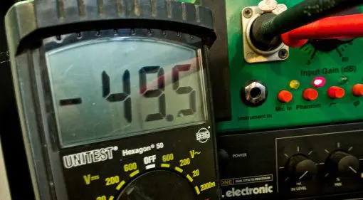 È possibile utilizzare un multimetro per misurare la tensione effettiva fornita dal preamplificatore. A tale scopo, attivate l’alimentazione, selezionate un intervallo di tensione adeguato sul vostro misuratore (ad esempio fino a 100 volt) e misurate attraverso i pin 1 e 2 o 1 e 3. Se il misuratore è abbastanza sensibile, si può vedere il drift di tensione, soprattutto dopo l’accensione della phantom. A volte ci vogliono molti secondi perché la tensione si accumuli. Alcuni preamplificatori creano deliberatamente questo “ramp time” (“tempo di rampa”) per proteggere i microfoni e altre apparecchiature. Allo stesso modo, può essere necessario un po’ di tempo per dissipare la tensione dopo lo spegnimento. È sempre una buona idea misurare il comportamento del preamplificatore, in modo da sapere quando è sicuro collegare o scollegare il microfono.