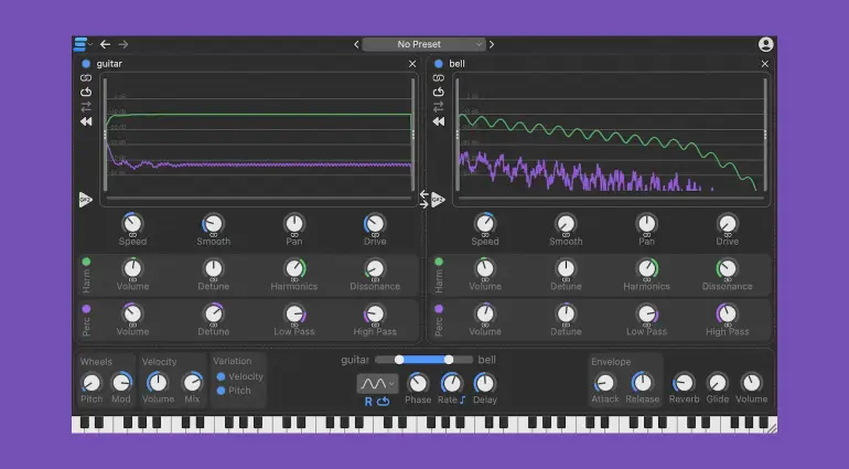 Entrambi le componenti possono essere modificate individualmente per dare forma al suono, che può poi essere riprodotto cromaticamente su diverse ottave utilizzando il motore del sintetizzatore del plugin, proprio come una patch di sintetizzatore. Naturalmente sono possibili anche ulteriori modifiche. Ad esempio, è possibile regolare il numero di armoniche, aggiungere drive o utilizzare la funzione Smooth per ammorbidire il suono.