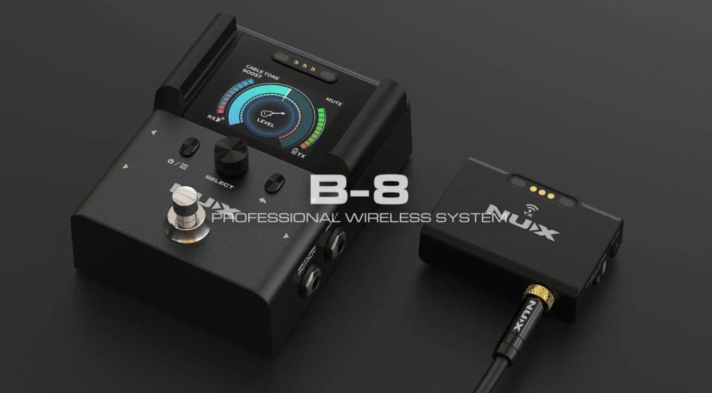 Il sistema wireless NUX B-8 racchiude in un unico pedale compatto una serie di utili funzioni. Queste includono un accordatore, un pedale boost, un loop FX e una DI box. Oltre al supporto per il caricamento di GIF.