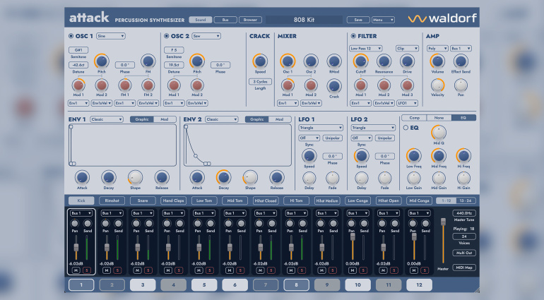 Fin dalle origini, Attack è stato un drum synthesizer pensato per permettere agli utenti di creare e scolpire suoni di batteria unici, combinando sintesi pura e campionamento. La prima versione arrivò come plugin nel 2001; un anno dopo Waldorf racchiuse il software in un’unità hardware chiamata RackAttack, un’operazione decisamente audace per l’epoca.
