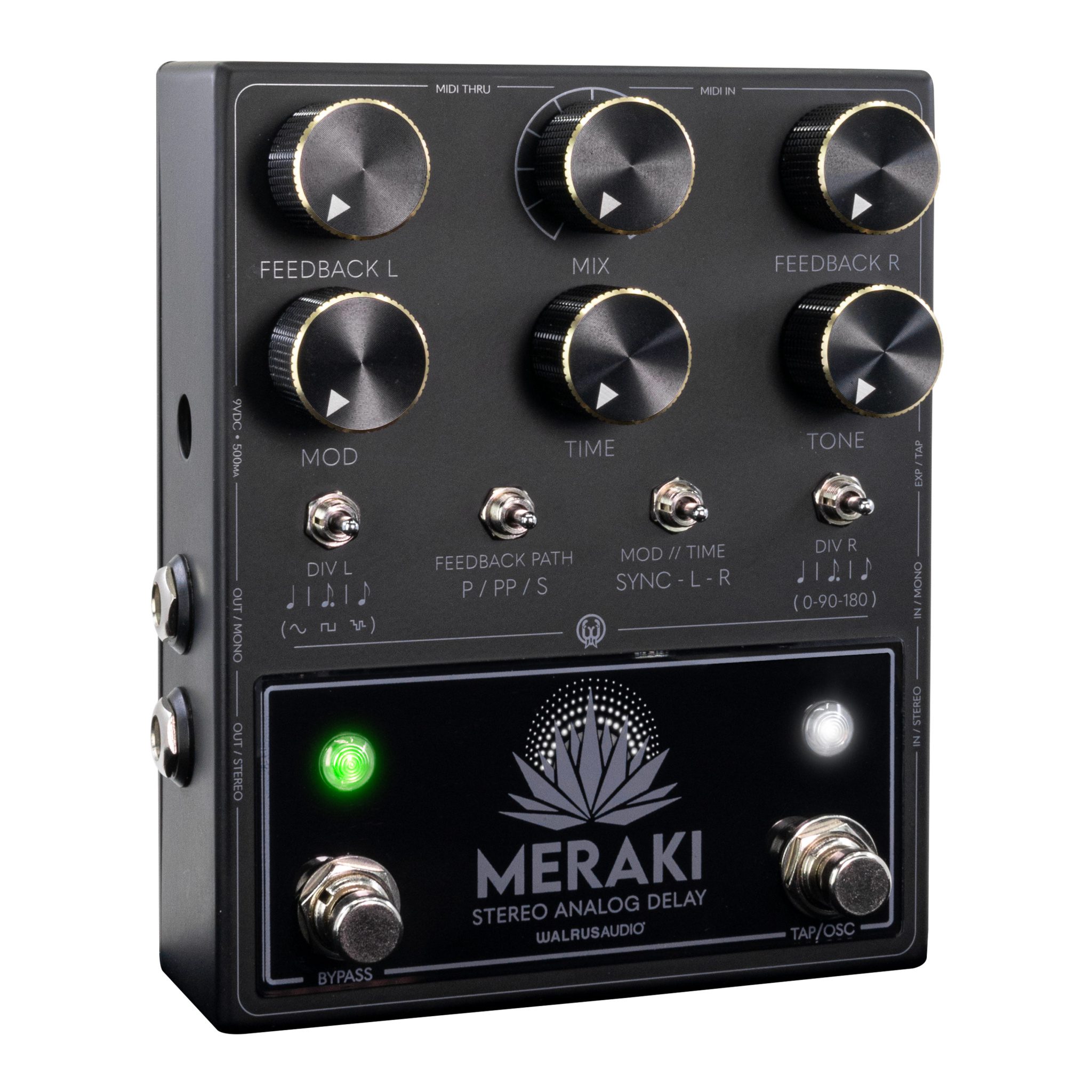Il Walrus Audio Meraki è un delay analogico stereo con otto chip MN3005 che producono ripetizioni calde e ricche con un tempo di delay fino a 1200 ms in modalità parallela, ping-pong e seriale.