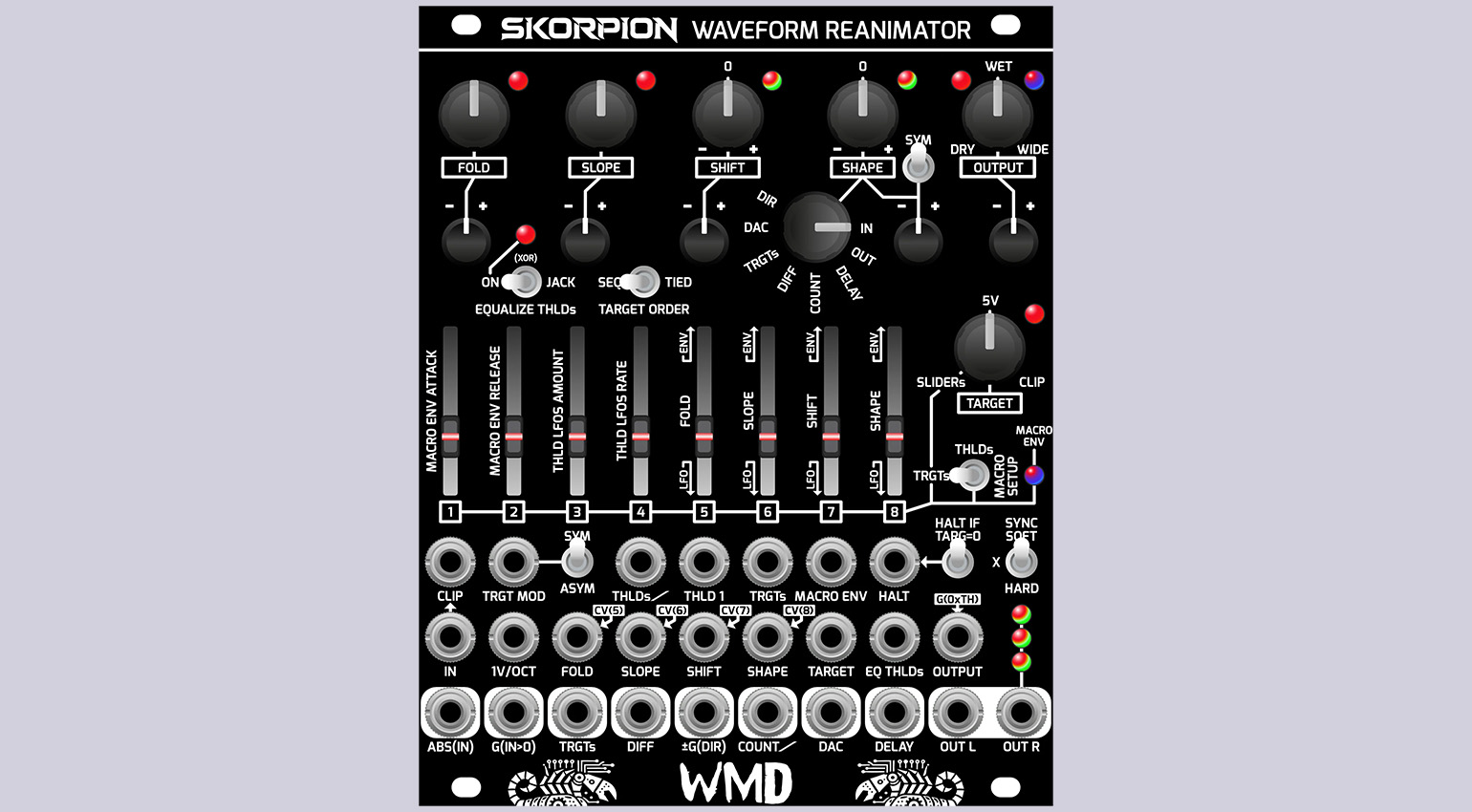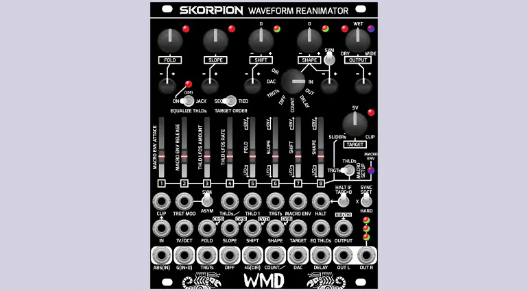 Definito un “rianimatore di forme d’onda”, lo Skorpion 20HP utilizza un nuovo stile di wavefolding basato sui vettori, che utilizza soglie e tensioni di destinazione per controllare un nucleo vettoriale. Secondo WMD, “Skorpion è un wavefolder analogico equivalente a otto stadi che consente di trasformare con precisione semplici forme d’onda in forme complesse con un’interfaccia fader divertente e pratica”.